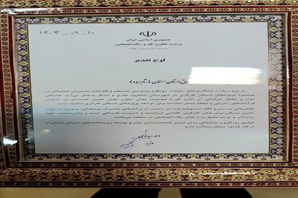 ببینید |️اهدای لوح تقدیر وزیر تعاون، کار و رفاه اجتماعی سمنان به مدیرکل راه و شهرسازی شرق استان