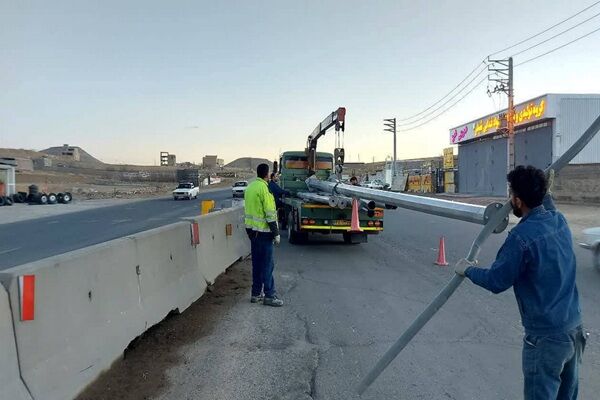 ببینید|جمع آوری و اصلاح تیرهای چراغ روشنایی جاده نقده - محمدیار